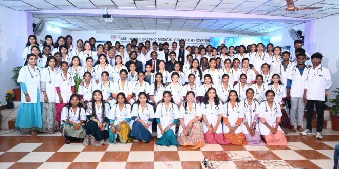 एएसआर होम्योपैथिक मेडिकल कॉलेज ने बुधवार को अपने 2025-2026 बैच के बीएचएमएस छात्रों के लिए एक महत्वपूर्ण व्हाइट कोट सेरेमनी का आयोजन किया । इसके साथ ही अत्याधुनिक तकनीक इंटीग्रेशन का भव्य उद्घाटन भी किया गया। यह ऐतिहासिक कार्यक्रम का औपचारिक लॉन्च करते हुए डॉ. एनटीआर स्वास्थ्य विज्ञान विश्वविद्यालय के वाइस चांसलर डॉ. पी. चंद्र शेखर ने कहा कि होम्योपैथिक मेडिकल शिक्षा के लिए एक नया बेंचमार्क स्थापित करता है, जो उनके संरक्षण में कॉलेज की शैक्षणिक उत्कृष्टता और नवाचार के प्रति प्रतिबद्धता की पुष्टि करता है।