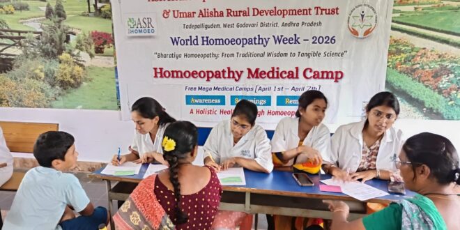 ताडेपल्लीगुडेम | एएसआर होम्योपैथिक मेडिकल कॉलेज, ताडेपल्लीगुडेम में पिछले एक सप्ताह से चलने वाले विश्व होम्योपैथी सप्ताह का आज भव्य समापन हुआ। कार्यक्रम का समापन उमर अलीशा ग्रामीण विकास ट्रस्ट (यूएआरडीटी) के सहयोग से कॉलेज परिसर में आयोजित एक विशाल निःशुल्क मेगा डायग्नोस्टिक शिविर के साथ हुआ।
