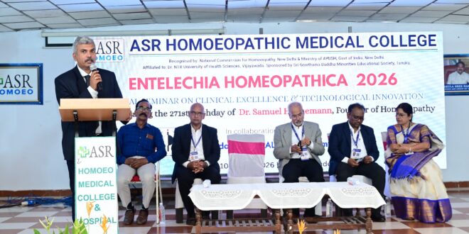 ताडेपल्लीगुडेम, 10 अप्रैल। होम्योपैथी के जनक, डॉ. फ्रेडरिक सैमुअल हैनीमैन की 271वीं जयंती मनाने के लिए, आज एएसआर. होम्योपैथिक मेडिकल कॉलेज और हॉस्पिटल की देखरेख में एंटेलेचिया होम्योपैथिका 2026 नेशनल संगोष्ठी बड़े धूमधाम से आयोजित किया गया। यह इवेंट उमर अलीशा रूरल डेवलपमेंट ट्रस्ट, आईपीएच फाउंडेशन और अलीशा एकेडमी के सहयोग से इंडियन होम्योपैथी: पारंपरिक ज्ञान को साइंस में बदलना थीम पर आयोजित किया गया था।